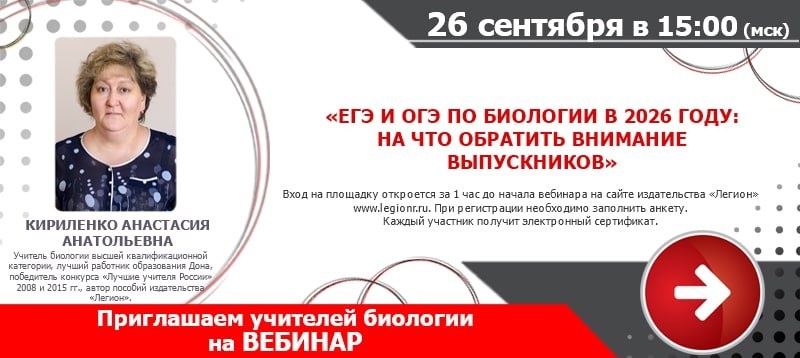 Вебинар "ЕГЭ и ОГЭ по биологии в 2026 году: на что обратить внимание выпускников" Дата: 26.09.2025 (Пт) Время: 15:00 Лектор Кириленко Анастасия Анатольевна - учитель биологии высшей квалификационной категории, лучший работник образования Дона, победитель конкурса «Лучшие учителя России» 2008 и 2015 гг., автор пособий издательства «Легион». Участие бесплатное. Требуется регистрация на сайте издательства