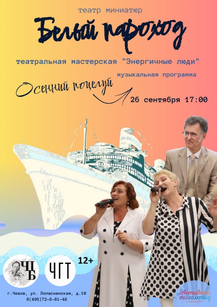 ✨ Лирический концерт «Осенний поцелуй» 🎶Театр миниатюр «Белый пароход» и творческая мастерская «Энергичные люди» выступят перед зрителями в Центральной библиотеке 🌸Прозвучат песни и стихи о любви, осени и теплых воспоминаниях о лете. 🚫 Возраст: 12+ 📆 26.09.2025 🕛 17:00 🏢 Центральная библиотека 📍 г. Чехов, ул. Лопасненская, д.10 🪙 Вход свободный❗️ ⭐Поддержать канал голосом ✅ Мероприятия Чехов https://dzen.ru/id/66cc4b48e9ef144699238a51 http://vk.com/chekhov_events http://dzen.ru/chekhov_events
