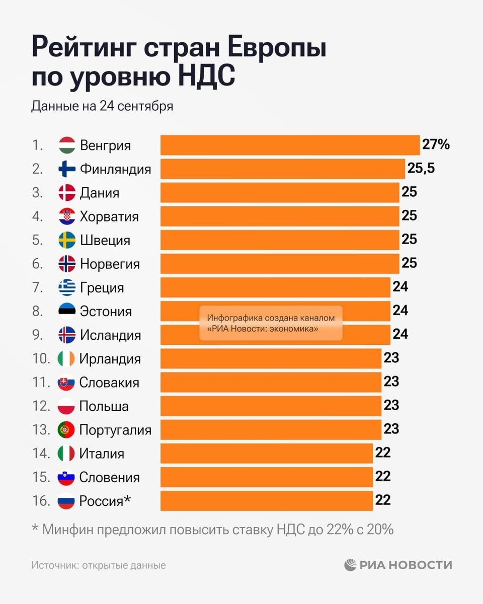 Самая высокая ставка налога на добавленную стоимость (НДС) среди европейских стран действует в Венгрии — 27%. Немного ниже показатель в Финляндии — 25,5%. Если в России будет утверждено предложение Минфина о повышении НДС до 22%, страна окажется во второй десятке по уровню налоговой нагрузки, отмечает анализ РИА Новости.