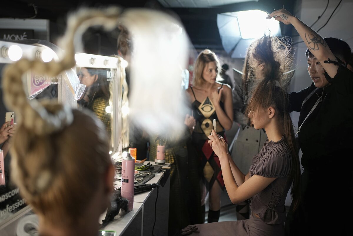 Показ начался с перформанса. Мы увидели современный танец, созданный Виктором Крамером, под электронные биты с классической инструментальной глубиной, благодаря чему подиум превратился в балетную сцену. Внутренний конфликт и напряжение в образах раскрываются через материалы и формы, так, например, Александра сталкивает простоту и роскошь через смешение трикотажа и шелковой тафты, объёмные силуэты, ленты и стразы противопоставляются гетрам и спортивным трико, а нежные цвета входят в резонанс с резкими акцентами.