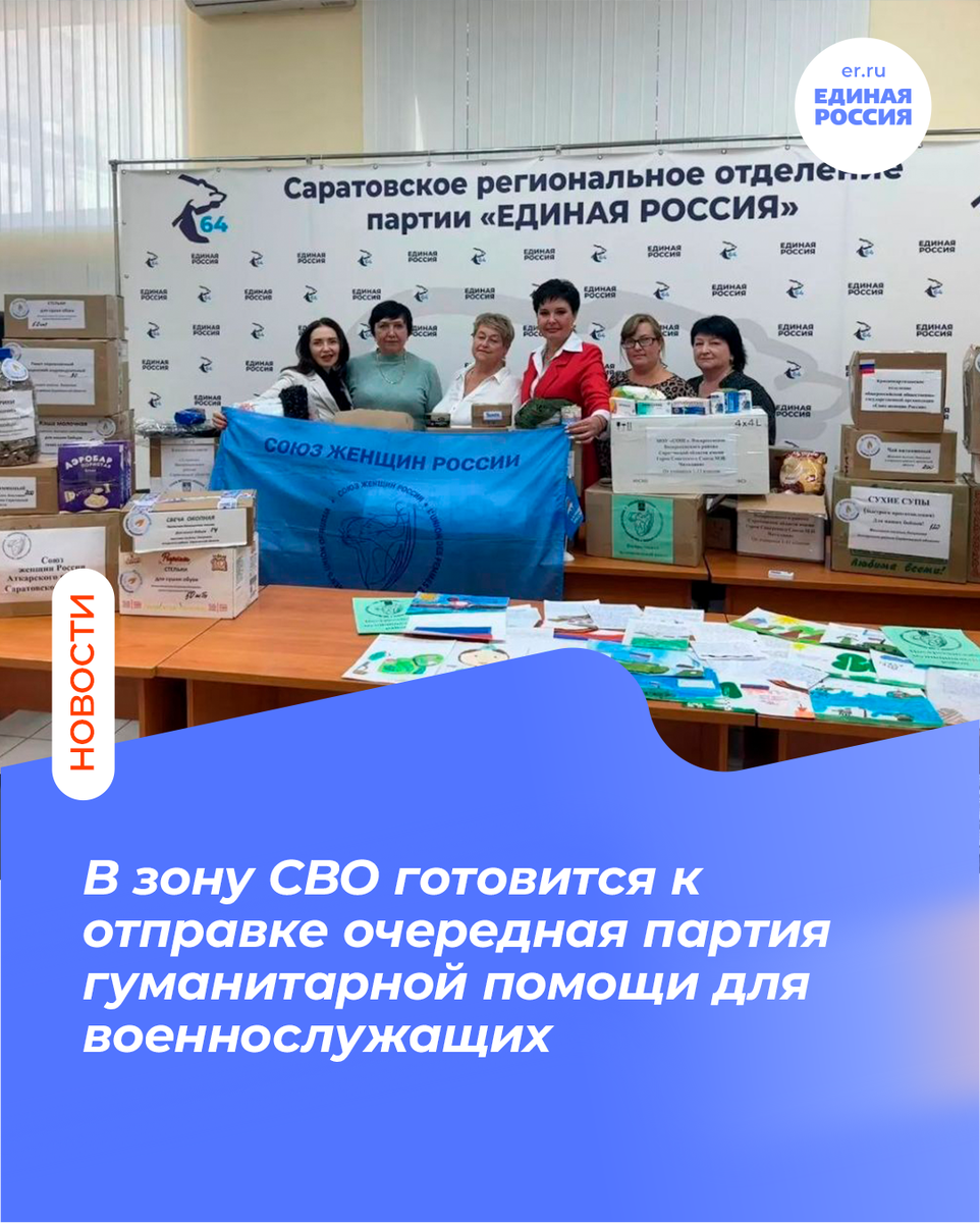 В зону специальной военной операции будет отправлена очередная партия гуманитарного груза, который был собран при содействии председателя комитета по образованию и культуре Саратовской областной Думы, председателя регионального отделения «Союз женщин России» Юлии Литневской.
