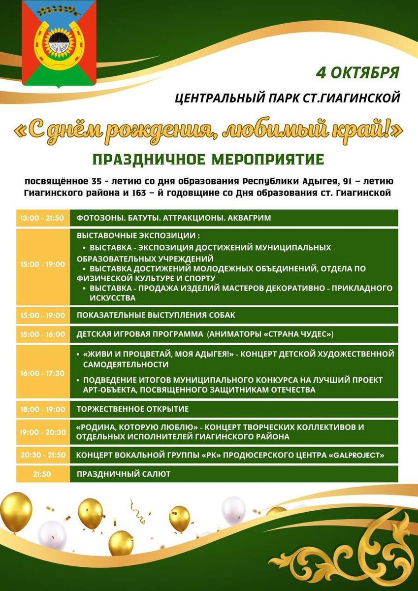 4 октября мы будем отмечать большой праздник, посвященный 35-летию со дня образования Республики Адыгея, 91-летию Гиагинского района и 163-ой годовщине со Дня образования ст. Гиагинской! Вас ждет насыщенная праздничная программа и масса положительных эмоций!