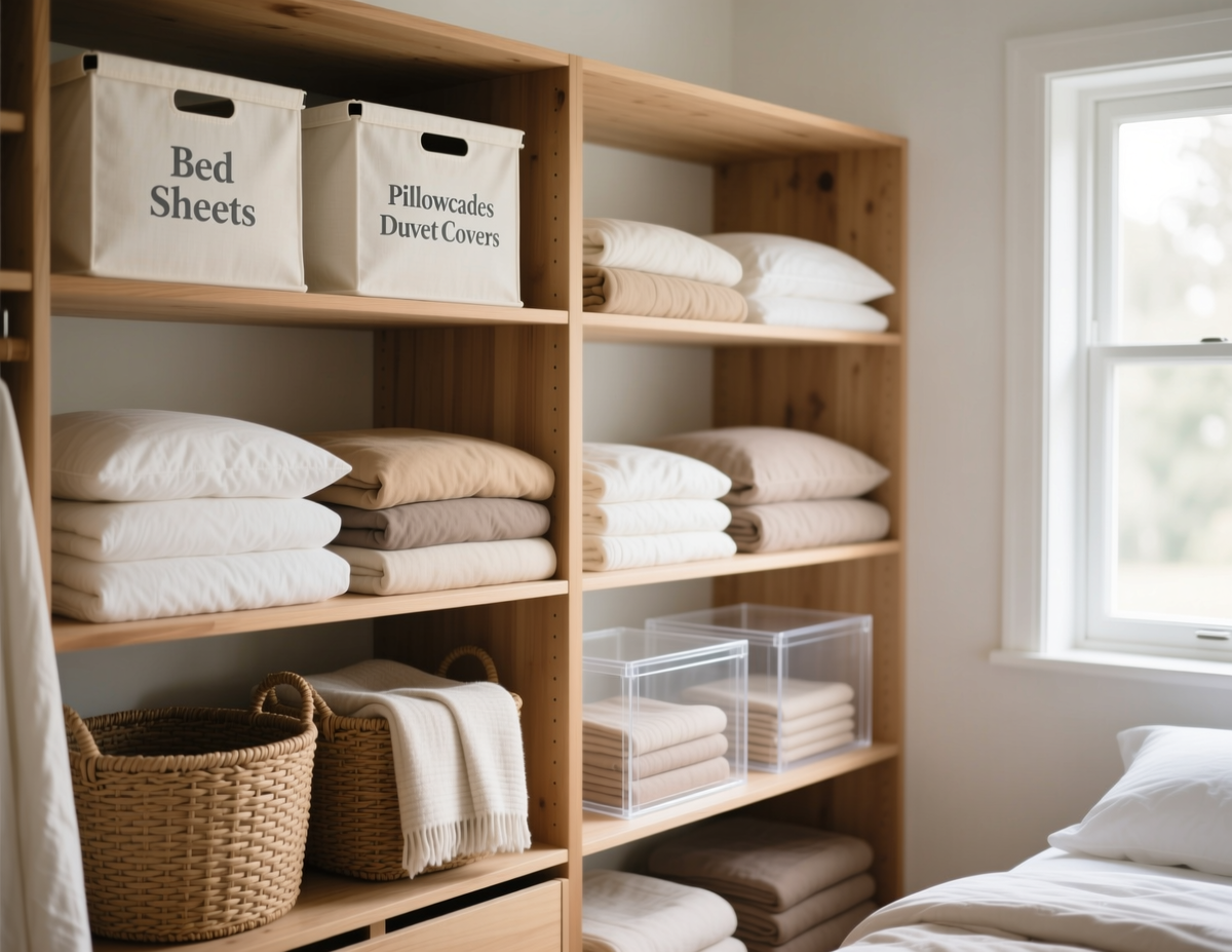 Складывайте белье свободно, без тугих заломов. Каждый комплект лучше хранить целиком — пододеяльник, простыня и наволочки вместе. Это не только экономит время при поиске, но и предотвращает деформацию ткани. Раз в сезон перекладывайте комплекты местами, чтобы избежать постоянных складок на одних и тех же участках.