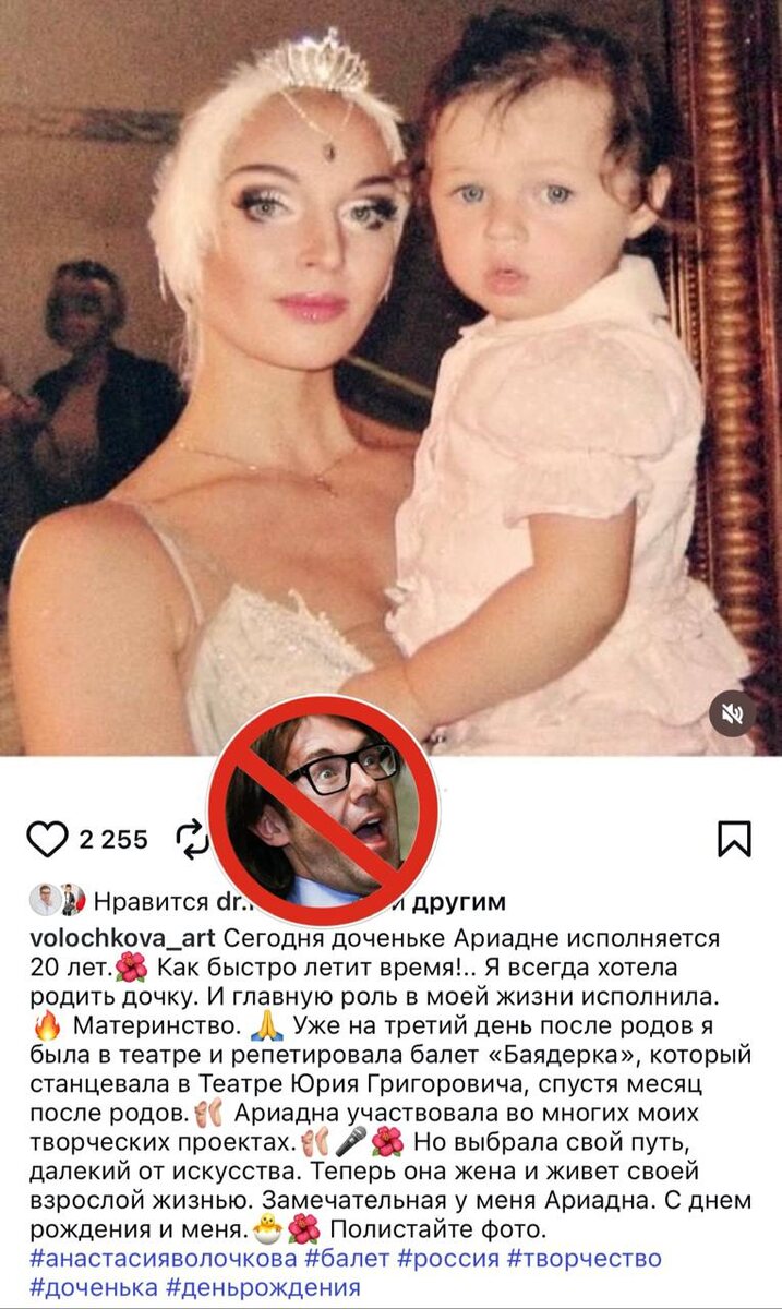 Волочкова очнулась от алкогольного делирия и выкатила пост-поздравление с 20-летием дочки. Как будто и не выливала на неё ушат помоев во всех последних интервью и не слала накуль вместе с другими добрыми людьми. Но правда в том, что поздравить Ариадну лично балерина всея Руси не может: безумную мать она заблочила