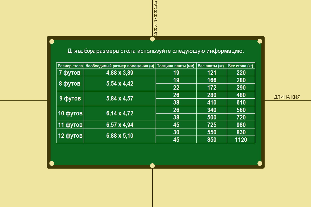 Размер бильярдного стола зависит от типа игры в бильярд, для которой он предназначен. Самыми популярными разновидностями бильярда являются: русская пирамида и американский пул. Для русского бильярда выпускаются столы, размер игрового поля которых варьируется от 7 до 12 футов. Для американского пула используются бильярдные столы с игровым полем в диапазоне 6-9 футов. Размер бильярдной комнаты классифицируется на минимальный и комфортный. Размер стола, футРазмер бильярдного стола, метрыРазмер игрового поля, метрыМинимальный размер помещения, метры12 футов3,80 х 2,003,55 х 1,757,00 х 5,2011 футов3,50 х 1,853,25 х 1,656,70 х 5,0510 футов3,20 х 1,602,95 х 1,506,40 х 4,909 футов2,90 х 1,552,65 х 1,306,10 х 4,758 футов2,60 х 1,402,35 х 1,155,60 х 4,407 футов2,30 х 1,252,05 х 1,005,30 х 4,25 Минимальный размер помещения бильярдного помещения указывается без учета установленной мебели. Минимальный размер комнаты рассчитывается по следующей формуле: «размер игрового поля + длина кия». Здесь прин