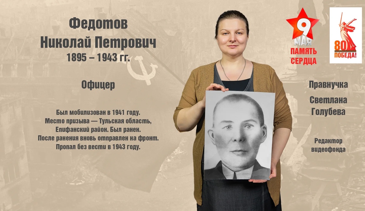 В честь 80-летия Победы MIR24.TV продолжает рассказ о героях Великой Отечественной войны в рамках проекта «Наша память сердца», посвященного фронтовым подвигам родных и близких сотрудников Межгосударственной телерадиокомпании «Мир». Николай Петрович Федотов ушел в первый год Великой Отечественной войны — в 1941 году. Уроженец Москвы призывался на передовую из Тульской области. Как рассказывает редактор видеофонда МТРК «Мир» Светлана Голубева, о боевом пути ее прадеда семье известно очень мало, поскольку в 1943 году красноармеец Николай Федотов пропал без вести. «Прадед родился в Москве в 1895 году. После 1917-го государством была объявлена новая политическая программа, и люди из городов переезжали в деревни, где занимались их подъемом и решали вопросы безграмотности. Таким образом, Николай Петрович оказался в Тульской области — в хуторе Сабуров Епифанского уезда (сегодня Куркинский район — прим. ред.)». В Тульской области Николай Федотов работал в одном из местных колхозов. По воспоми