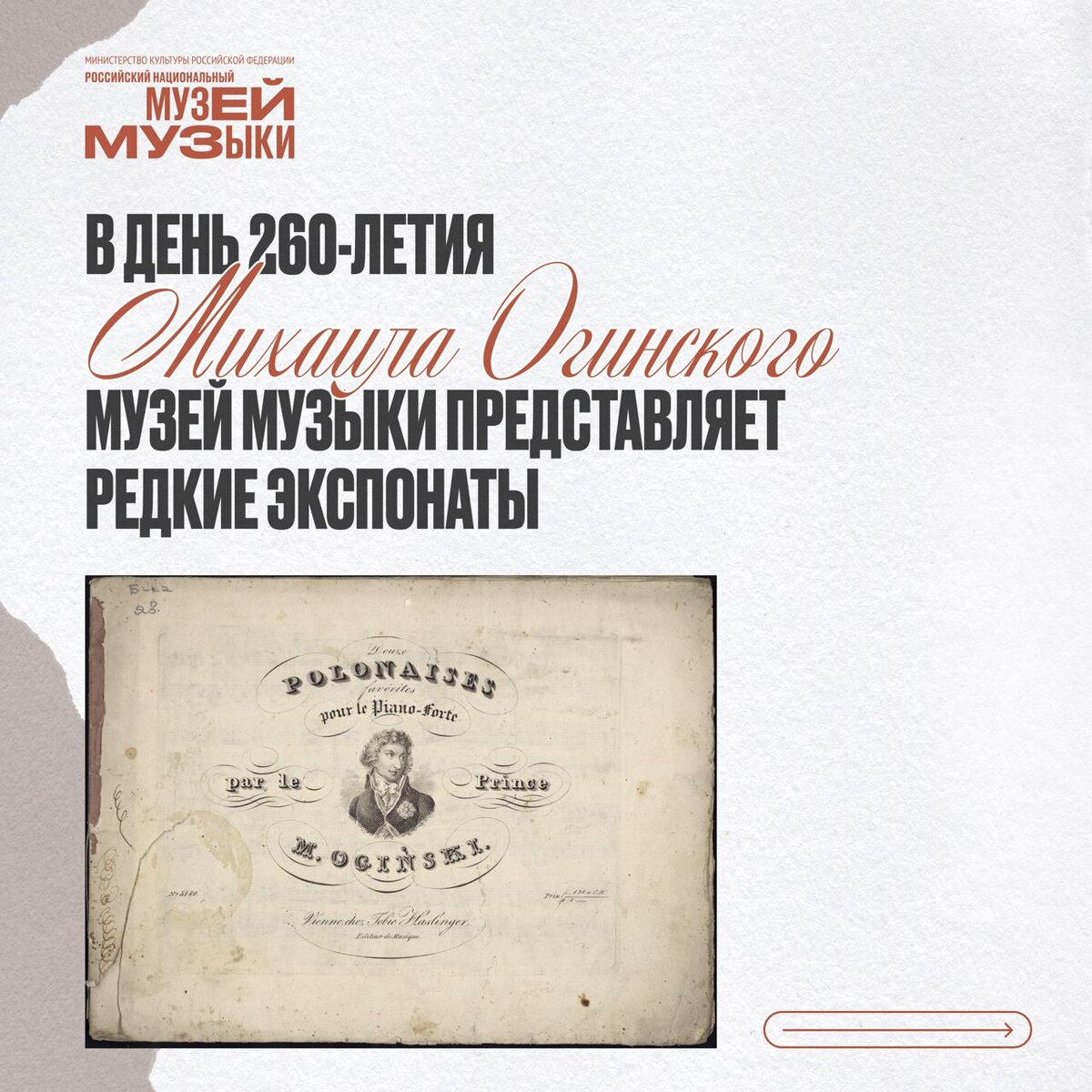 В день 260-летия Огинского Музей музыки делится уникальными артефактами. Листайте карточки и узнайте, как творчество Огинского повлияло на русскую культуру! ✏️