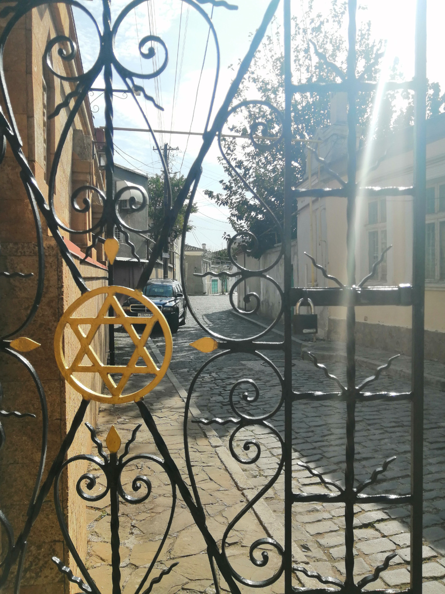 Шла я по Старому городу,старыми домиками интересовалась. Погода располагала к прогулкам,жаль времени было ,как всегда, немного. В Крыму,после непогоды и ливней ,было несколько дней жарко,а потом резко похолодало,до 20 градусов.Хорошее лето,по питерским меркам,если бы не сильный ветер. Похоже,что с похолоданием немного ожили крымские котики. Их встретилось много на моем пути,разного окраса. И не только котики встретились,но и такой охранник! Прохожу мимо еврейского кафе "Йоськин кот",ещё не зная,что через двор-синагога.Это здание на заднем плане. Настенные панно со сценками из жизни. Панно о приезде в Евпаторию Николая ll. А дальше вижу интересный указатель про синагогу и стену плача! Прохожу и вижу на стене интересный текст про вклад евреев в развитие города Евпатории. Фасад синагоги украшает круглое окно с витражом в виде большой шестиконечной звезды. Такая же шестиконечная звезда присутствует и на металлических воротах молитвенного дома. Главный вход устроен у западн