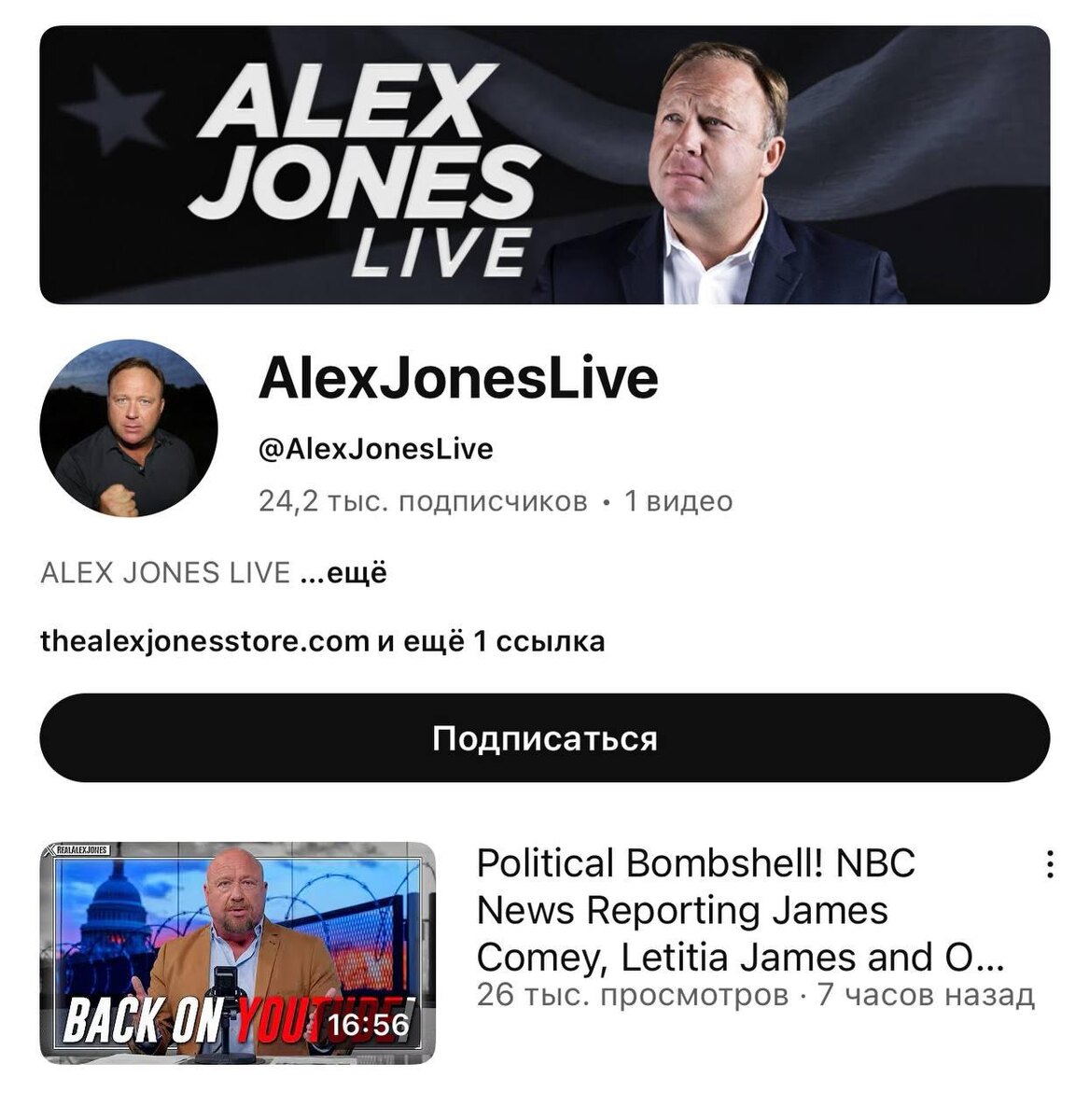 Правый комментатор и конспиролог Алекс Джонс вновь завёл канал на YouTube. В 2018 году платформа уже удалила его канал с 2,5 миллионами подписчиков. И не прошло и 12 часов, как YouTube его вновь заблокировал. Оттепели мы не ждём… @lobushkin