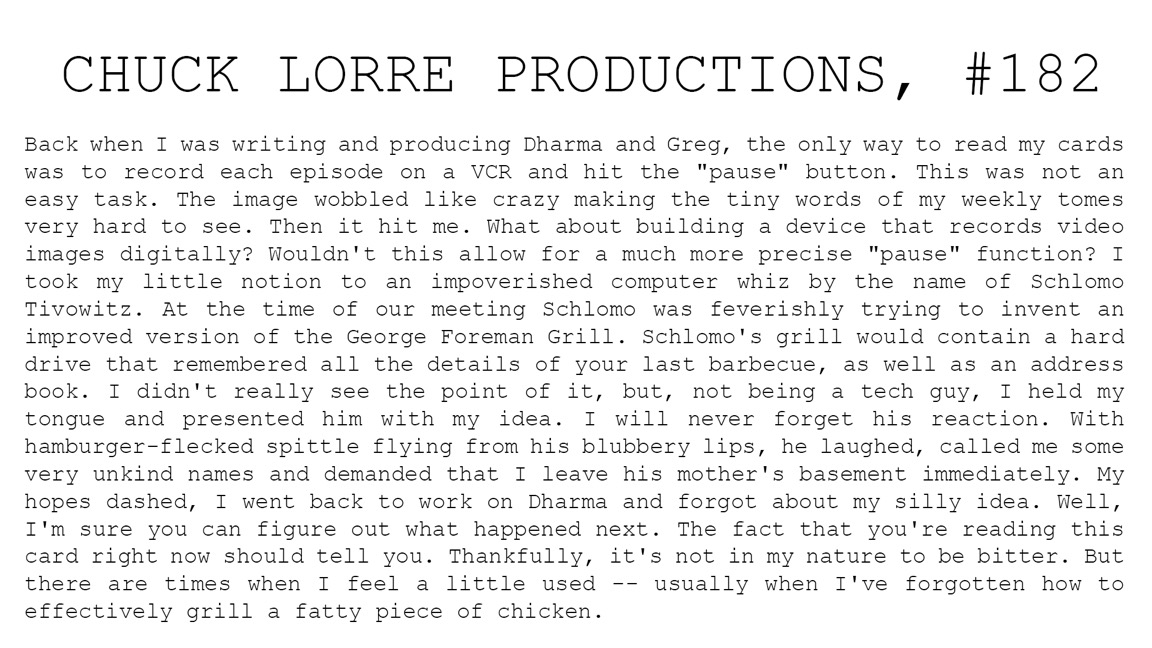 Когда я писал и продюсировал сериал «Дхарма и Грег», единственным способом прочитать свои карточки было записывать каждую серию на видеомагнитофон и нажимать кнопку «пауза». ⏸️ Это было нелегкой задачей. Изображение сильно дрожало, из-за чего крошечные слова моего еженедельного предсказания было очень трудно разглядеть. 🔮 Тогда мне пришла в голову идея. А что, если создать устройство, которое записывает видеоизображение в цифровом формате? Разве это не позволило бы использовать гораздо более точную функцию «пауза»? 💡 Я поделился своей маленькой идеей с бедным компьютерным гением по имени Шломо Тивовиц. Во время нашей встречи Шломо лихорадочно пытался изобрести улучшенную версию гриля Джорджа Формана. 🍔 Гриль Шломо должен был содержать жесткий диск, который запоминал бы все детали вашего последнего барбекю, а также адресную книгу. Я не совсем понимал, в чем смысл, но, не будучи техническим специалистом, я промолчал и представил ему свою идею. 🤐 Я никогда не забуду его реакцию. С бры