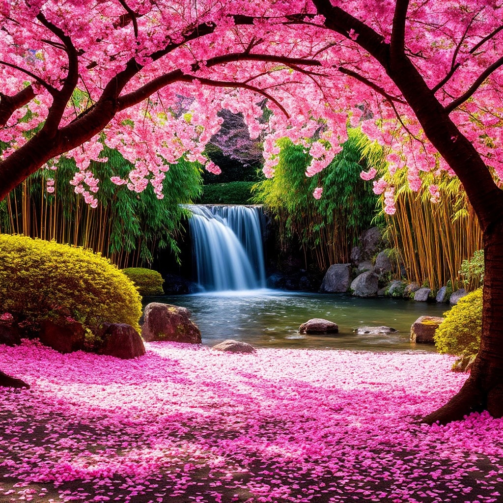 Цветущая сакура в японском саду. Нежные розовые лепестки, словно снежинки, кружатся в воздухе и мягко опускаются на землю, создавая волшебный розовый ковёр. Ветки деревьев склоняются под тяжестью цветов, создавая причудливые арки, через которые пробиваются лучи тёплого весеннего солнца. Вдали журчит небольшой водопад, его кристально чистая вода падает в каменный бассейн, создавая успокаивающий ритм. Вокруг бассейна растут изящные бамбуковые ростки, их зелёные стебли покачиваются на ветру, словно танцуя в такт падающей воде. Воздух наполнен тонким, сладковатым ароматом цветов, который смешивается с запахом влажной земли и свежей зелени. В этом уголке природы время будто замедляется, каждая деталь пропитана спокойствием и гармонией. А вечером, когда солнце опускается за горизонт, сад преображается. Мягкий свет фонарей освещает дорожки, создавая причудливые тени, а лепестки сакуры, освещённые снизу, кажутся ещё более нежными и воздушными. В этот момент сад становится похожим на сказочно