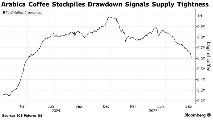 Запасы кофе арабика на складах, контролируемых биржей, за последние три дня сократились более чем на 52 508 мешков Фьючерсы на кофе арабика на Нью-Йоркской бирже выросли из-за значительного снижения запасов. За последние три дня количество кофе на складах сократилось более чем на 52 508 мешков, что обострило опасения по поводу возможного дефицита в ближайшем будущем. Это произошло на фоне задержек поставок из Бразилии, которая является крупнейшим производителем данного сорта кофе. Наиболее активный контракт вырос на 2,9% и достиг отметки в $3,784 за фунт. Этот рост последовал за падением на прошлой неделе, когда в Бразилии возобновились дожди, улучшившие условия для важного этапа цветения. Метеорологи, такие как Надиара Перейра из Climatempo, прогнозируют уменьшение осадков в большинстве регионов, где выращивается кофе, хотя в некоторых местах ожидается влажная погода. В Лондоне фьючерсы на робусту стабилизировались после того, как трейдеры оценили незначительный ущерб от мощного тайфу