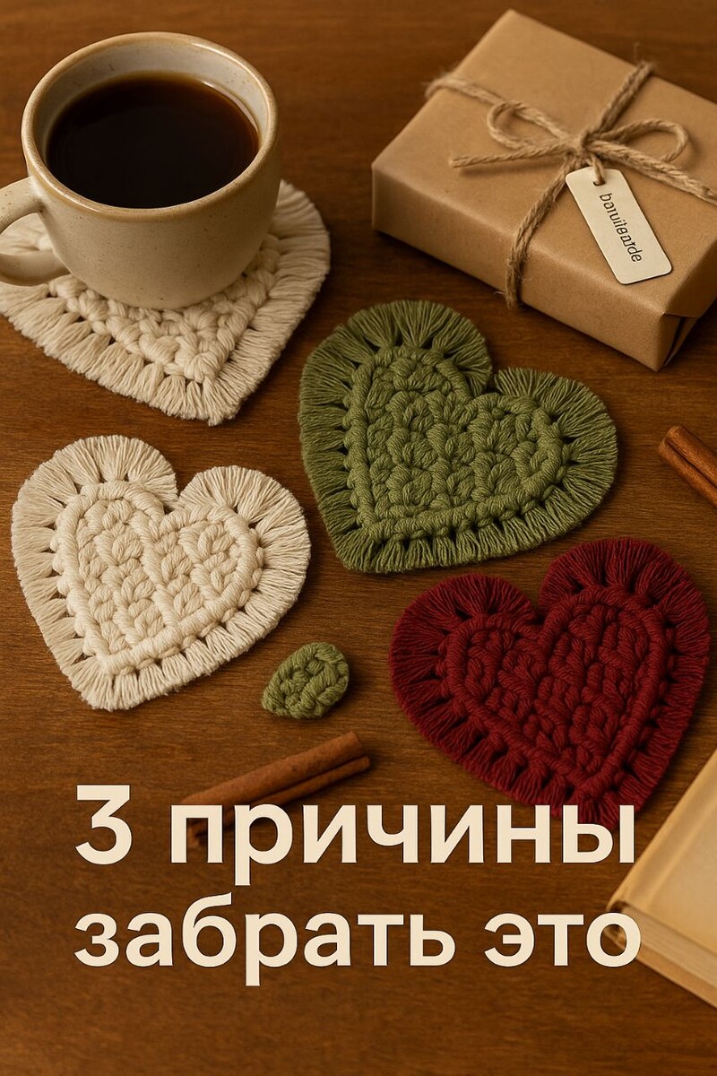 3 причины забрать этот набор сердечек - подставок в подарок или для себя. Уют, который ставишь на стол. Плотный хлопковый шнур держит форму, кружка стоит устойчиво, капли не страшны. Маленький ритуал с утра и дома теплее. Идеальный вариант одним комплектом. Подойдёт для дома и для офиса: соло под любимую кружку или парой для кофе с подругой.Оттенки, которые легко впишутся в любой интерьер: молочный, олива,бордо, оранжевый, розовый. Эксклюзив ручной работы.Каждый узел сплетен мной, бахрома аккуратно расчёсанна, повтор " точь-в-точь" невозможен, серия ограниченна. У меня готово всего 3 набора на эту неделю. Такой палитры может больше не быть. Кто хочет успеть забрать свой комплект пишите в л/с слово "Набор" Нужна одна штука под конкретную кружку пиши "Чашка", подберу оттенок. Отправка по РФ Почтой России, доставка оплачивается отдельно.Предоплата 50/50. Придет в подарочной коробке, перевязана джутовым шпагатом и подпись на бирке по желанию. Цена 500₽/ шт.