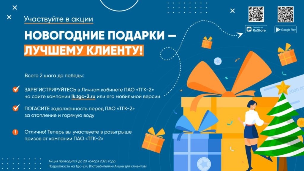 До 20 ноября 2025 года продлится акция для жителей «Новогодние подарки – лучшему клиенту»! Акция проводится на территории Архангельской, Вологодской, Костромской и Ярославской областей для потребителей, которые получают от ПАО «ТГК-2» тепло и горячую воду и напрямую оплачивают эти услуги.