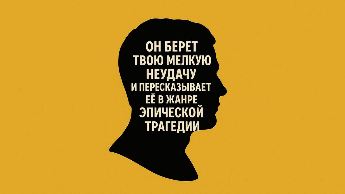 В итоге вы остаетесь один на один с этим вечным спойлером, который портит вам завязку еще не начавшегося дня. Он шепчет, что проект провалится, шутка будет несмешной, а пятно на рубашке имеет форму провальной жизненной стратегии. И да, он еще и обвинит вас в том, что вы его слушаете. Таков итог: ваш главный орган выживания эволюционировал в циничного клоуна, который смеется последним. И всегда.