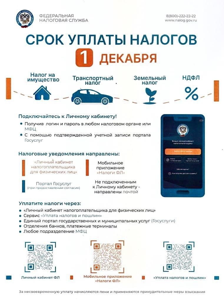 Хоть сейчас бумажные "письма счастья" от Налоговой и не приходят, платить налоги надо. Срок уплаты имущественных налогов за 2024 год истекает уже 1 декабря. Начисления уже загружены в личные кабинеты налогоплательщиков. ПОДПИШИСЬ 🔴 ПРЕДЛОЖИ Ⓜ МАХ НАШ