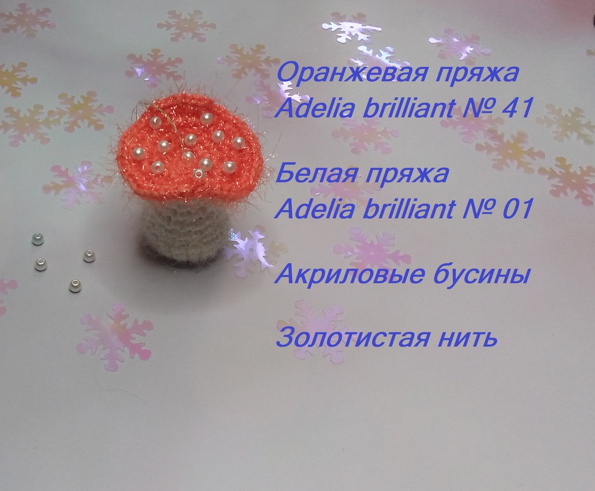1 ряд: 6 сбн в кольцо амигуруми; 2 ряд: 6 прибавок (2 сбн в каждую петлю)=12 петель; 3 ряд: 12 сбн; 4 ряд: (1 сбн+прибавка)х6=18 петель; 5 ряд: 18 прибавок (2 сбн в каждую петлю)=36 петель; 6 ряд: (1 сбн+прибавка)х18=54 петли. Шляпку украшаем бусинами и пришиваем петельку для подвешивания на ёлку. Ножка гриба. 1 ряд: 6 сбн в кольцо амигуруми; 2 ряд: 6 прибавок (2 сбн в каждую петлю)=12 петель; 3 ряд: (1 сбн+прибавка)х6=18 петель; 4 ряд: (2 сбн+прибавка)х6=24 петли; 5-6 ряды: по 24 сбн в каждом ряду; 7 ряд: (2 сбн + убавка)х6=18 петель; 8-9 ряды: по 18 сбн в каждом ряду; 10 ряд: (1 сбн + убавка)х6=12 петель; 11-14 ряды: по 12 сбн в каждом ряду; 15 ряд: (1 сбн+прибавка)х6=18 петель; 16 ряд: (2 сбн+прибавка)х6=24 петли. Ножку набиваем наполнителем и пришиваем к шляпке ниткой подходящего цвета. Вышиваем ножку золотистой нитью ил украшаем как душа пожелает😊