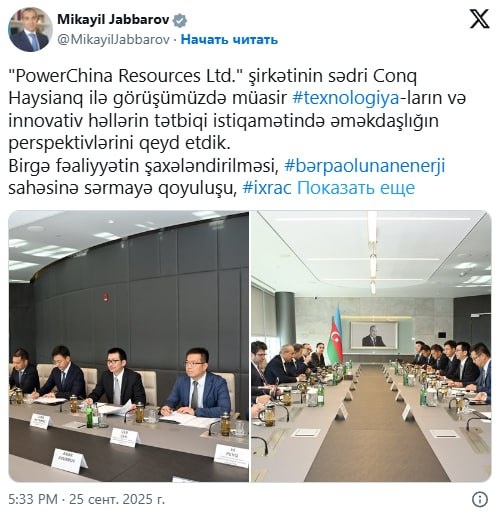 π¦πΏπ¨π³ ΠΠΈΠ½ΠΈΡΡΡ ΡΠΊΠΎΠ½ΠΎΠΌΠΈΠΊΠΈ ΠΠ·Π΅ΡΠ±Π°ΠΉΠ΄ΠΆΠ°Π½Π° ΠΠΈΠΊΠ°ΠΈΠ» ΠΠΆΠ°Π±Π±Π°ΡΠΎΠ² Π²ΡΡΡΠ΅ΡΠΈΠ»ΡΡ Ρ ΠΏΡΠ΅Π΄ΡΠ΅Π΄Π°ΡΠ΅Π»Π΅ΠΌ ΠΊΠΎΠΌΠΏΠ°Π½ΠΈΠΈ PowerChina Resources Ltd. Π§ΠΆΡΠ½ Π₯Π°ΠΉΡΡΠ½ΠΎΠΌ. ΠΠ± ΡΡΠΎΠΌ Π³Π»Π°Π²Π° ΡΠΊΠΎΠ½ΠΎΠΌΠΈΡΠ΅ΡΠΊΠΎΠ³ΠΎ Π²Π΅Π΄ΠΎΠΌΡΡΠ²Π° Π½Π°ΠΏΠΈΡΠ°Π» Π² ΡΠ²ΠΎΠ΅ΠΌ Π°ΠΊΠΊΠ°ΡΠ½ΡΠ΅ Π² ΡΠΎΡΡΠ΅ΡΠΈ Π₯. "ΠΡΠΌΠ΅ΡΠΈΠ»ΠΈ ΠΏΠ΅ΡΡΠΏΠ΅ΠΊΡΠΈΠ²Ρ ΡΠΎΡΡΡΠ΄Π½ΠΈΡΠ΅ΡΡΠ²Π° Π² Π½Π°ΠΏΡΠ°Π²Π»Π΅Π½ΠΈΠΈ ΠΏΡΠΈΠΌΠ΅Π½Π΅Π½ΠΈΡ ΡΠΎΠ²ΡΠ΅ΠΌΠ΅Π½Π½ΡΡ