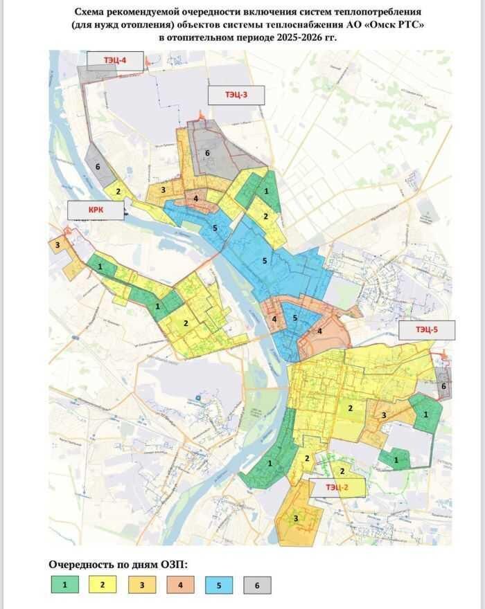 АО «ОмскРТС» подготовило карту, где указана рекомендуемая последовательность включения отопления в разных районах города. Схему опубликовал телеграм-канал «Новости Омска». По данным карты, первыми тепло получают дома в части Нефтяников (район Заозерной и Менделеева), на отдельных улицах Левобережья, Иртышской набережной и в Октябрьском округе (3-я Молодёжная и часть Чкаловского). В последнюю очередь батареи потеплеют в Центральном округе (районы Северные, Герцена, Октябрьская, Фрунзе и др.) и в некоторых районах Нефтяников (Красный Путь, проспект Мира и соседние улицы). Жители уже отмечают появление тепла в некоторых домах. Так, батареи стали тёплыми на улице 50 лет Профсоюзов в Советском округе, а на Левобережье — на улице Лукашевича. Ранее в мэрии сообщили, что подключение отопления по всему городу займёт примерно три недели. Такой поэтапный подход помогает равномерно распределить нагрузку на сеть и обеспечивает стабильное начало отопительного сезона. Читайте также на портале Om1.ru