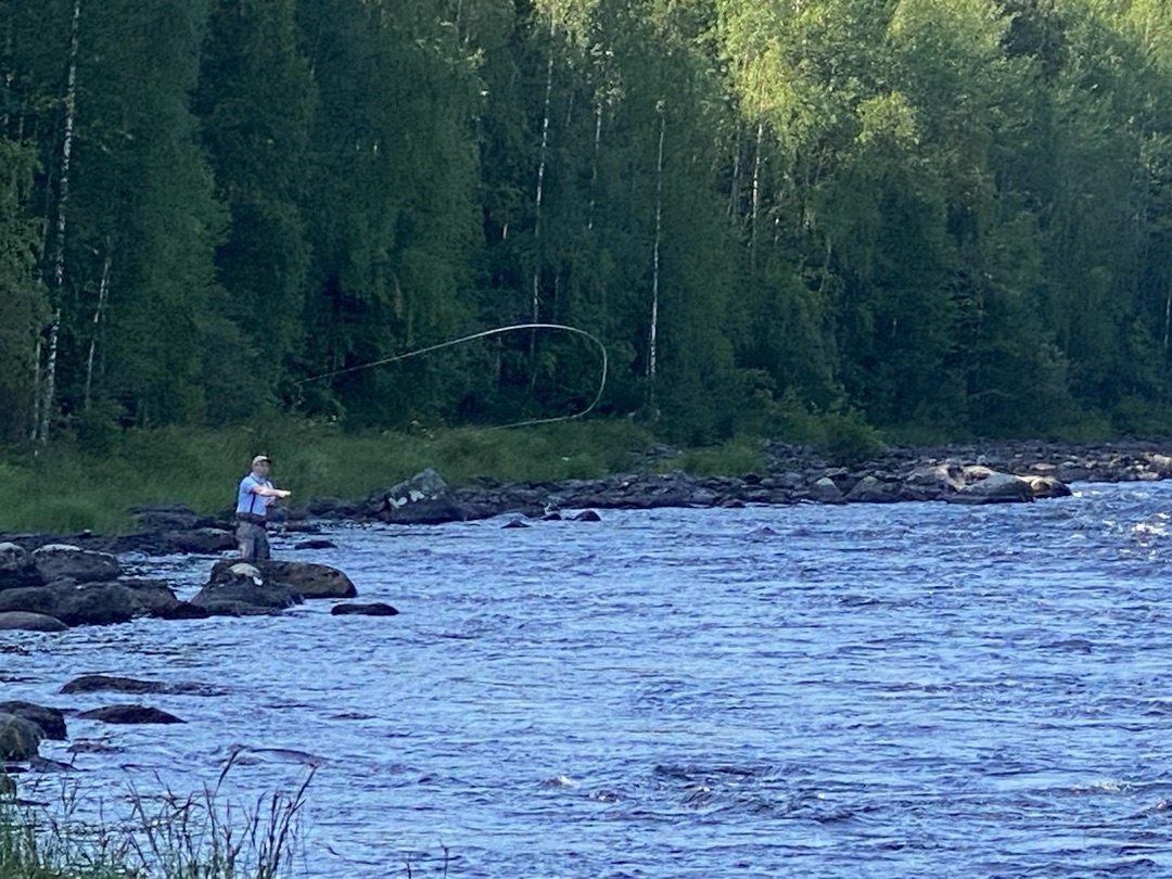 Лето, начало августа. Погода радует жаркими днями и теплыми ночами. Не лучшее время для лососевой рыбалки, но мне не усидеть в городе и выкроив пару дней мчу с товарищем по увлечению в места, где есть шанс получить потяжечку и натянутый шнур))). В лесу очень сухо. Жарко. А температуры воды +25. Ужас))). Рыбалка предвещалась трудовая, но нас не испугать. Да и не только за рыбой едем... Первый выход на реку решили сделать сразу по приезду. Перекусили и пошли ловить. Заскочили на один из дальних участков: глубокая канавка между двумя порогами. Течение умеренное и есть бурлилка от притопленных камней, так что с кислородным режимом должно быть все хорошо. Первый же проход приносит сначала хорошую потяжку, а на последующей проводке рыбка уверенно берет мушку. Рыбка дала бой, парканулась не с первой попытки и даже не со второй. Температура воды все таки очень высокая и рыбку пришлось долго реанимировать. Сил потратила много, но в итоге все закончилось хорошо - уплыла. В прилове очень мног