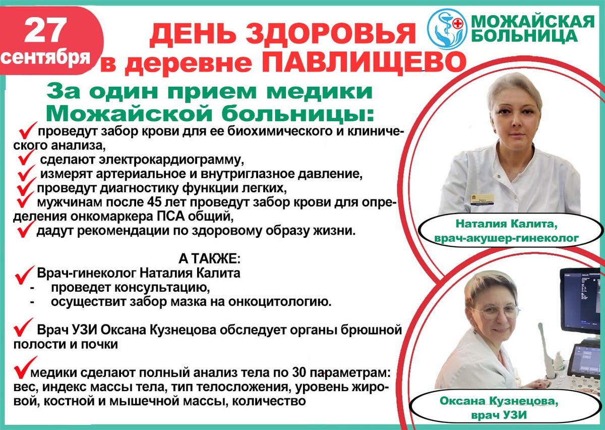 Жителям Павлищево проверят здоровье 27 сентября в медкабинете детского сада д.Павлищево пройдет День здоровья За один прием медики Можайской больницы: 📌проведут забор крови для ее биохимического и клинического анализа, 📌сделают электрокардиограмму, 📌измерят артериальное и внутриглазное давление, 📌проведут диагностику функции легких, 📌мужчинам после 45 лет проведут забор крови для определения онкомаркера ПСА общий, 📌дадут рекомендации по здоровому образу жизни. Врач-гинеколог Наталья Калита проведет общий осмотр женщин, в том числе молочных желез, осуществит забор мазка на онкоцитологию. УЗИ органов брюшной полости и почек проведет врач УЗИ Оксана Кузнецова. Будет сделан полный анализ тела по 30 параметрам: вес, индекс массы тела, тип телосложения, уровень жировой, костной и мышечной массы, содержание воды. Медики будут принимать с 9.00 до 13.00 по адресу: д.Павлищево, 14. Удобно: не мы едем к врачам, а они едут к нам!