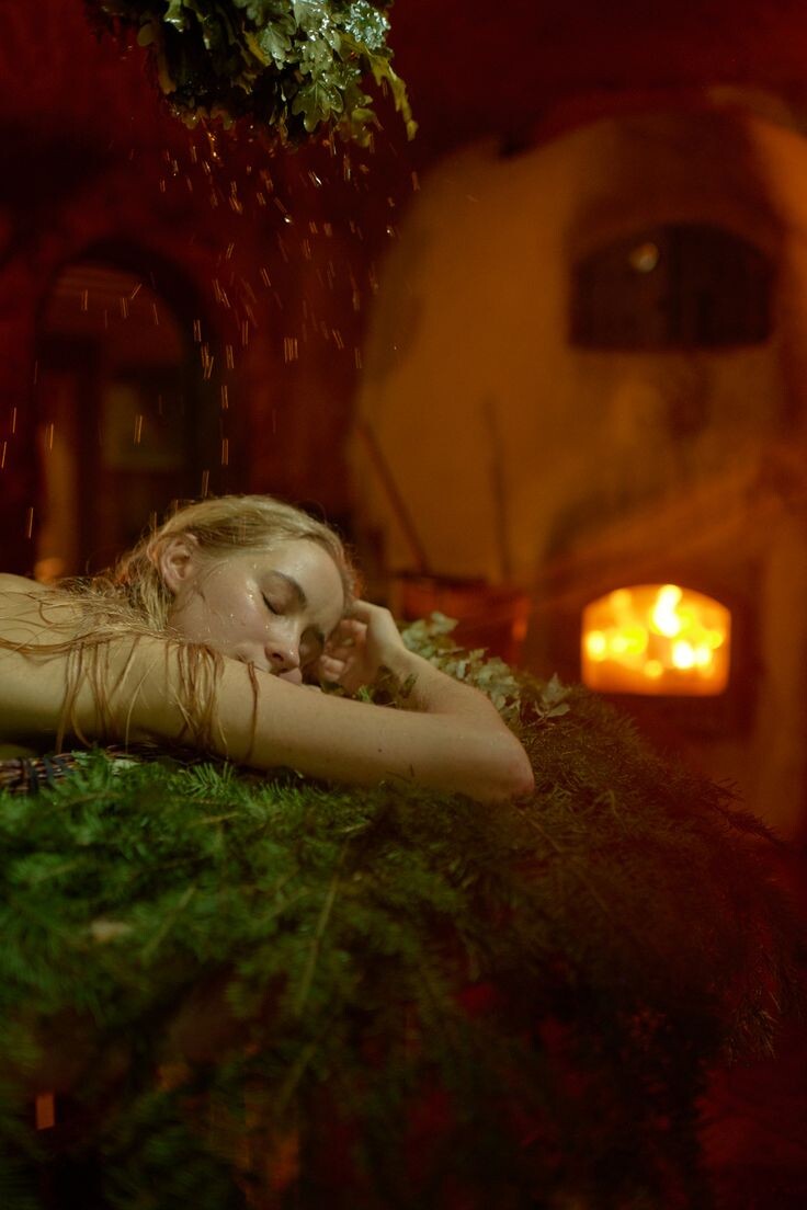 В парилке воздух был влажным и горячим, но не обжигающим. Свет проникал сквозь панорамное окно, через которое можно было любоваться ручьем и лесом, раскинувшимся за ним. Теплые отблески на стенах, камни у трубы, которые давали невероятный жар.