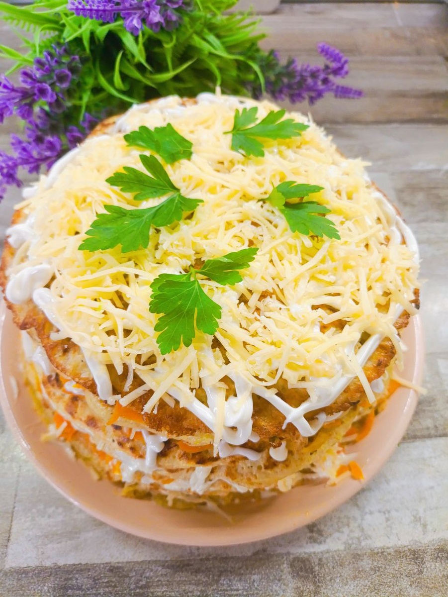 ТОРТ КАБАЧКОВЫЙ🤩 У кого кабачки просятся на стол? 😅 Сегодня делюсь рецептом торта! Он и красивый, и вкусный, и даже полезный. 😉 Нам понадобится: •Для "коржей": • Кабачок (средний, спелый) • 2 яйца ) • Молоко или кефир (что есть в холодильнике) • Мука (сколько возьмет, до консистенции блинного теста) • Соль (щепотка) • Паприка, специи, зелень (для аромата и настроения) • Разрыхлитель (пол чайной ложки) • Растительное масло (для жарки) • Для начинки (тут можно импровизировать!): • Морковь (на крупной терке) • Чеснок (пару зубчиков, для пикантности) • Репчатый лук (небольшая головка, мелко порезать) • Сыр (тертый, любой, который любите) • Майонез (домашний или магазинный, на ваш вкус. Можно заменить сметаной или греческим йогуртом, если хочется полегче) Готовим магию: 1. Кабачок трем на мелкой терке. 2. Добавляем яйца, молоко/кефир, муку, соль, паприку, специи, зелень и разрыхлитель. Тщательно перемешиваем, чтобы получилось тесто, как на бл