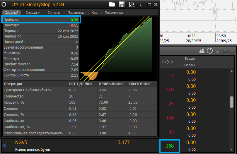 Ранее я уже рассказывала, что решила повторно запустить робота по алгоритму Step by step на мой любимый фьючерс на природный газ. Какое-то время назад я уже запускала его и мне не понравилось два момента. Сейчас я понимаю, что тогда не до конца разобралась. Терминал от Альфа-Банка не корректно считает доходность, поэтому все намного лучше, чем я думала ранее. Правда со вторым моментом я еще не разобралась, но это отдельная история. Об этом я сейчас не могу сказать ничего. Если вы еще не знаете, что такое Step by Step, почитать больше про алгоритм и другие роботы от Альфа-Банка можно вот в этой подборке статей. Для начала покажу, что я вижу. В терминале доходность по роботу меньше 1 рубля и тут не важно я считаю по LIFO или FIFO. Картина принципиально не меняется. При этом одновременно в портфеле я могу видеть, что в тот день, когда был сделан скриншот, робот заработал 368 рублей, но из этой суммы надо вычесть комиссии брокера! Но с расчетом комиссий все тоже не просто. Если я открыва