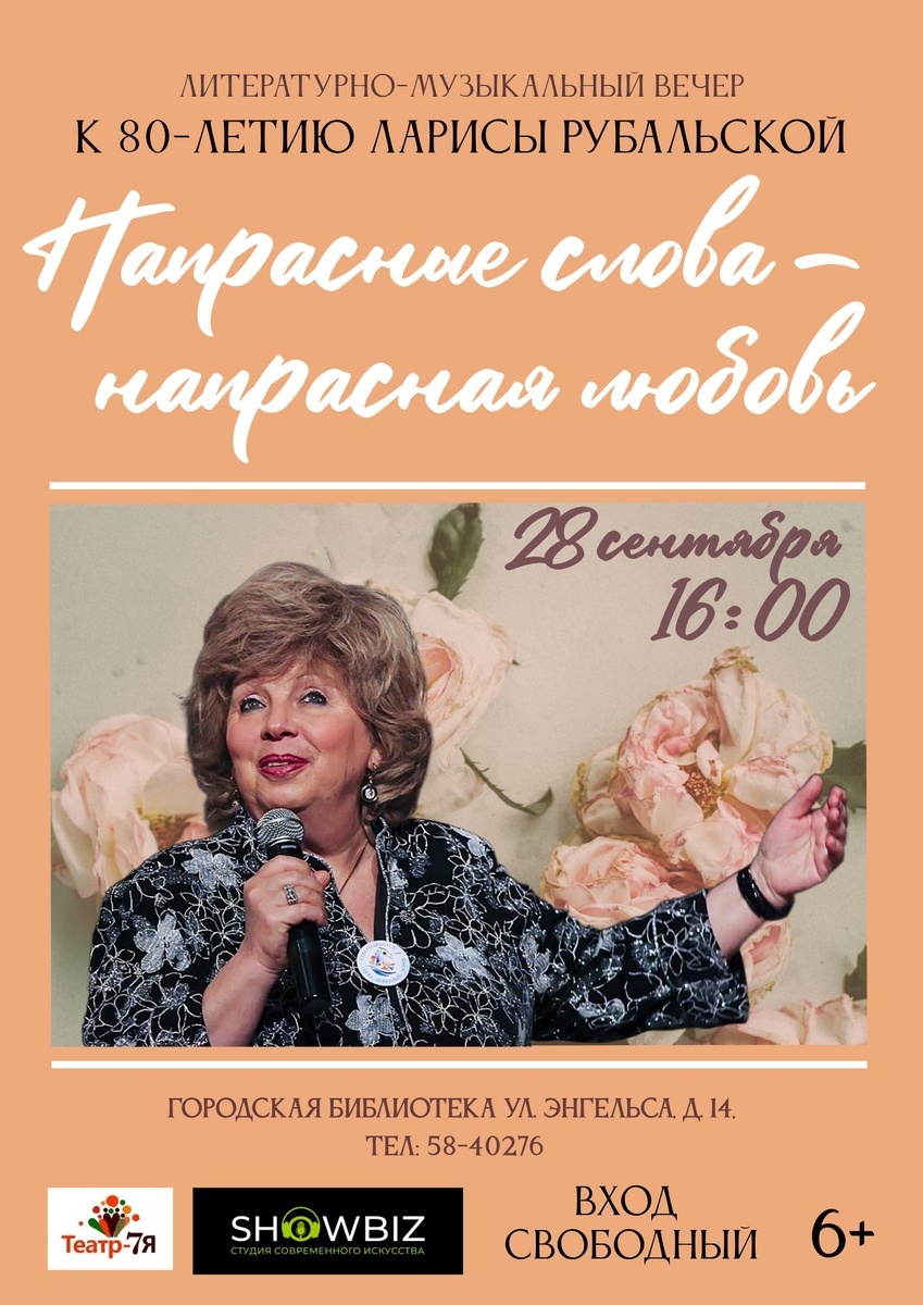 🎶28 сентября в 16:00 в Центральной библиотеке в Обнинске пройдёт литературно- музыкальный вечер «Напрасные слова — напрасная любовь» к 80-летию Ларисы Рубальской. ✍Вход бесплатный. Регистрация - https://forms.yandex.ru/cloud/68d3cbaa02848f99076657ab. Обнинск, ул. Энгельса, 14. 👍 Подписаться | Ваша реклама