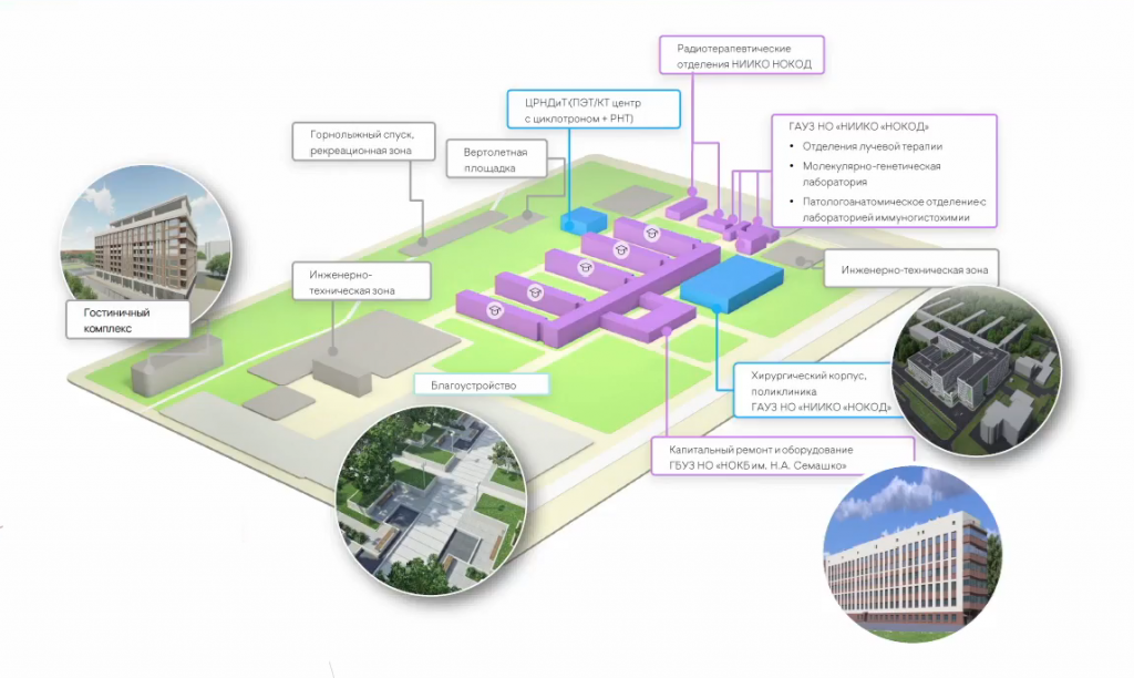 Между вертолетной площадкой и 4–5 корпусами больницы возведут ПЭТ/КТ-центр с циклотроном. Также «Город здоровья» включит центр ядерной медицины, на создание которого потребуется 4,7 млрд рублей. В свою очередь, реконструкция и оснащение больницы имени Семашко обойдутся примерно в 12 млрд рублей.
