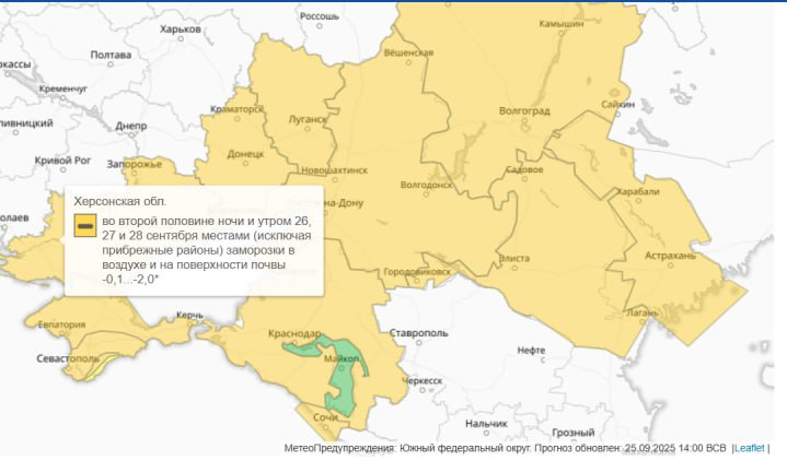 В Херсонской области с 26 по 28 сентября прогнозируются первые осенние заморозки. По данным Главного управления МЧС России по Херсонской области, ночью и утром температура воздуха и поверхности почвы местами опустится до −0,1…−2,0°. Исключением станут прибрежные районы, где существенных похолоданий не ожидается.