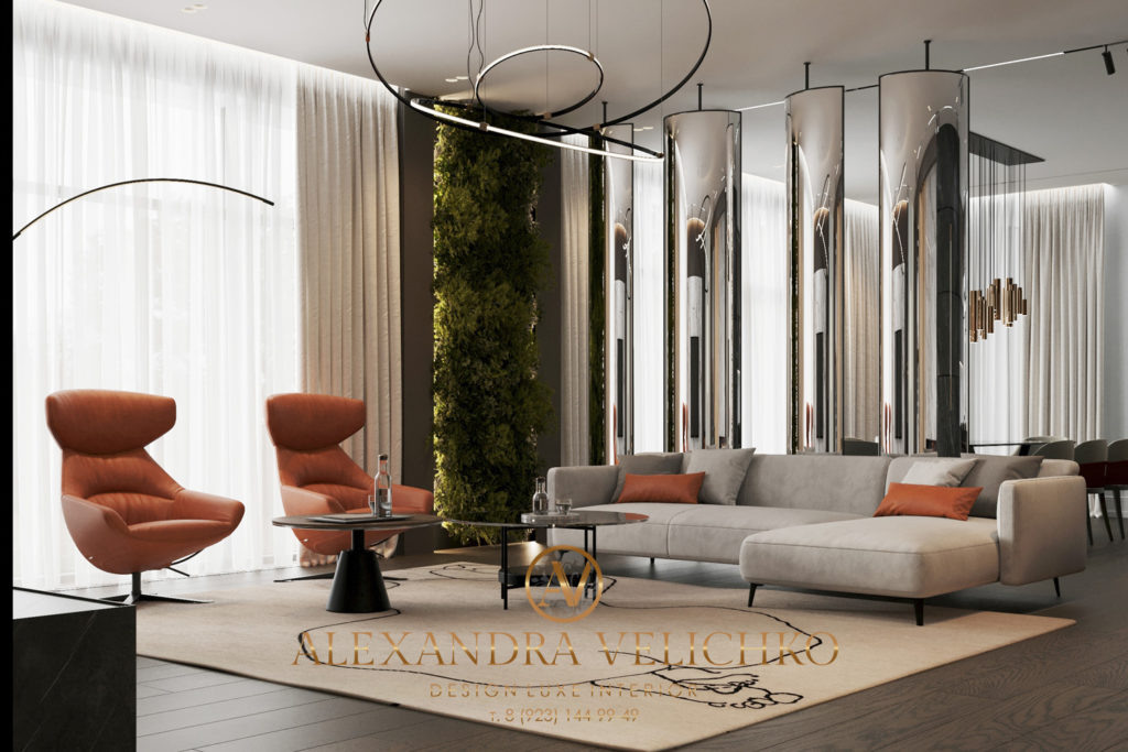 Премиальный дизайн интерьера всегда начинается с планирования, проектирования и выбора концепции. Разработка элитных дизайн-проектов – это не просто способ оформления пространства. Это воплощение смелых изысканных идей, персонализация жизненного стиля с использованием уникальных элементов дизайна. Меня зовут Александра Величко, я – дизайнер интерьеров, специализируюсь на проектировании премиальных дизайнов и создании комплексных архитектурных решений. Продолжаю показывать вам свои работы, сегодня вы увидите элитный дизайн частного загородного дома. Начнем с кухни-гостинной, ее дизайн вышел статусным, респектабельным, продуманным до мелочей. Пространство кухни-гостиной гармонично поделено на две функциональные зоны. Первая – просторная кухня-столовая с полноценной обеденной зоной, где можно принимать гостей. Вторая – зона уютной, стильной гостиной с дизайнерским камином. В дизайне гостиной камин стал не просто функциональным элементом, а настоящим произведением искусства. Сложные формы