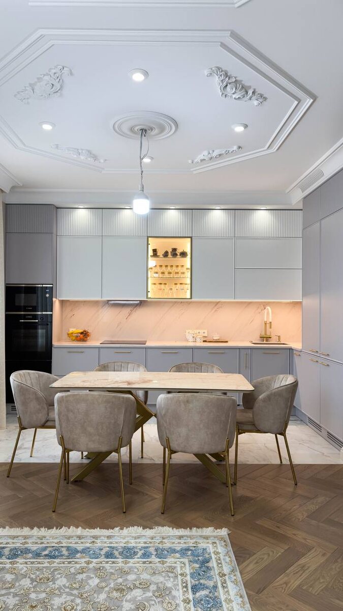 Стильная угловая кухня в светлых тонах, здесь изящество в каждой детали