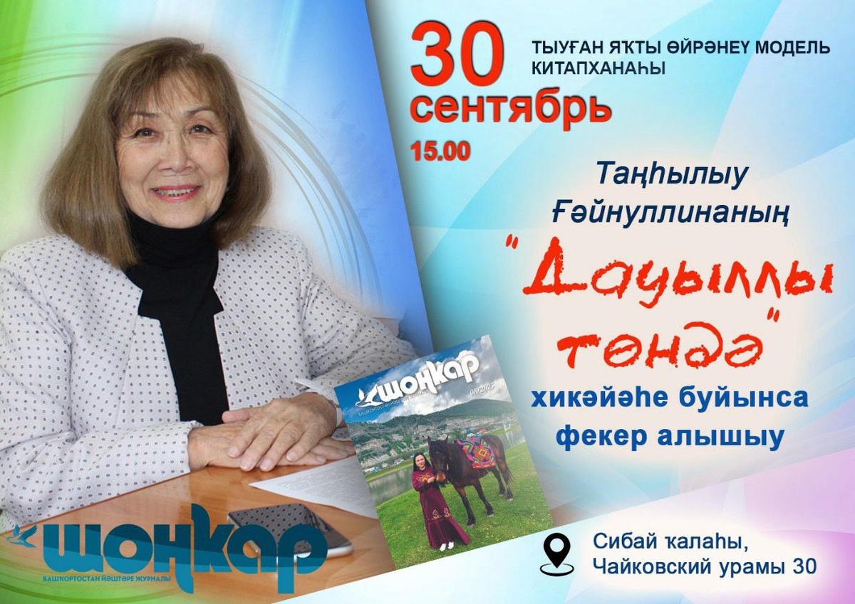 📢📢📢Әҙәбиәт һөйөүселәр иғтибарына! Таңһылыу Ғәйнуллинаның “Шоңҡар” (№8, 2025) журналында донъя күргән "Дауыллы төндә" хикәйәһе буйынса фекер алышыу Ваҡыты🔮: 30 сентябрь 15-00 сәғәттә, Урыны: Сибай ҡалаһы, Чайковский урамы 30 Тыуған яҡты өйрәнеү модель китапханаһы📖 Сарала ҡатнашырға теләүселәр, рәхим итегеҙ!