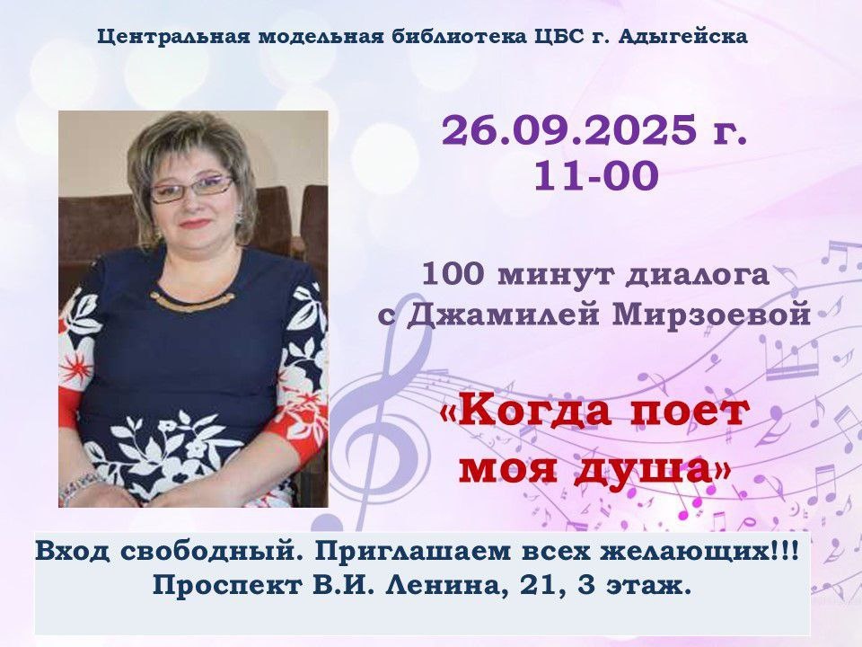 Невозможно представить сцену Центра народной культуры последних десятилетий без этого удивительного человека. Её проникновенный, тёплый и душевный голос, неповторимая манера исполнения давно полюбились жителям и гостям нашего города. Центральная модельная библиотека города Адыгейска приглашает всех желающих 26 сентября в 11:00ч на 100 минут откровенного диалога с Джамилей Мирзоевой. Вместе мы проведём незабываемое время, наполненное музыкой, воспоминаниями и вдохновением. Вход свободный. Приходите и подарите себе встречу с настоящим искусством! 🗓️26.09.2025 в 11:00 📍 Адрес: г. Адыгейск, проспект В. И. Ленина, 21, 3 этаж.