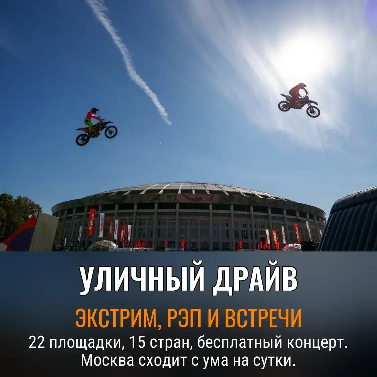 Прыгай на голову! Фестиваль «Уличный драйв» в Лужниках — сытная помойка для любителей экстрима и дармовых концертов. На 22 площадках участники с 12:00 ловят адреналин так, будто завтра Олимпиада по выживанию. Паркуристы, скейтеры, BMXеры, мотофристайлеры и дети на беговелах нарушают законы физики, а тусовка из 15 стран демонстрирует: травмы — не повод для грусти 😏. Знаменитости вживую ждут нервных фанатов, чтобы услышать душещипательные вопросы. На десерт — Кипелов, Xzibit и еще бесплатная музыка в придачу. Фестиваль для тех, кому не хватает острых ощущений и бесплатного мерча., Следите за новостями 📩