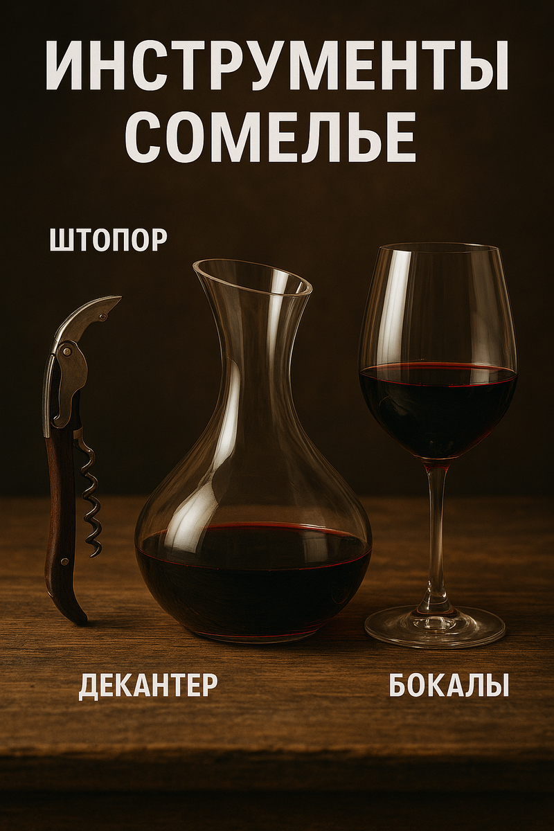 Профессиональный сомелье не обходится без набора специальных инструментов, которые помогают раскрыть вкус и аромат вина. Главный инструмент сомелье. Классический «штопор сомелье» имеет нож для среза капсулы, спираль и рычаг для удобного извлечения пробки. Стеклянный сосуд, используемый для аэрации вина. Позволяет напитку «подышать» и раскрыть аромат, а также отделяет вино от осадка. Выбор бокала влияет на восприятие вина: Эти аксессуары — не просто детали сервировки, а часть культуры вина. Они помогают гостю почувствовать всю глубину напитка и создают атмосферу профессионализма.