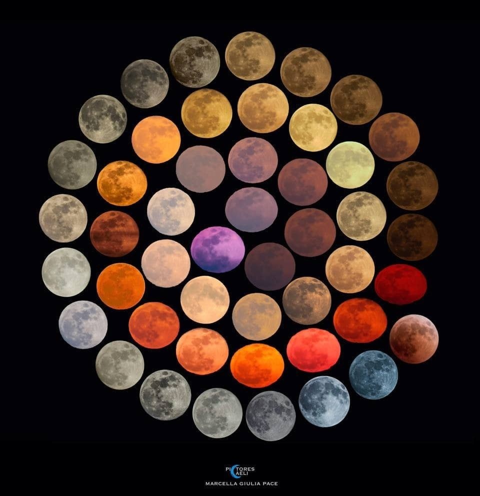 Какого на самом деле цвета Луна? Серого с коричневатыми оттенками. А вот если смотреть на наш спутник через атмосферу Земли, то цвета могут быть совершенно разными. Астрофотограф Марчелла Джулия Паче на протяжении 10 лет снимала полнолуния из разных регионов Италии и представила «коллекцию» разных цветов Луны в зависимости от высоты над горизонтом, влажности воздуха, пыли и других параметров земной атмосферы.