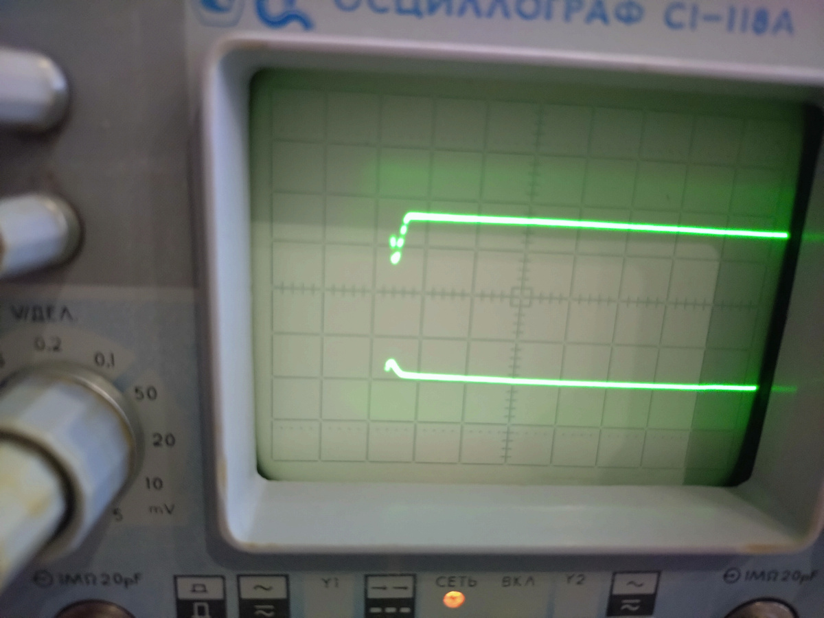 Немного подумав, решил кое-что проверить. Стало интересно происхождение этих всплесков. Подал на вход осциллографа сигнал с частотой 50 Гц и подтвердил свою догадку. Количество всплесков равнялось количеству полупериодов поданного сигнала, а это могло означать только одно: электролиты в схемах питания вышли из строя. По этой причине стала видна отдалённая «работа» диодного моста. Хоть мне и писали адепты «неубиваемого конденсатора из СССР», что такое невозможно и что ходят они тысячелетиями вместе с «флажками», всё же сотни других людей вместе со мной знают, что это не так.