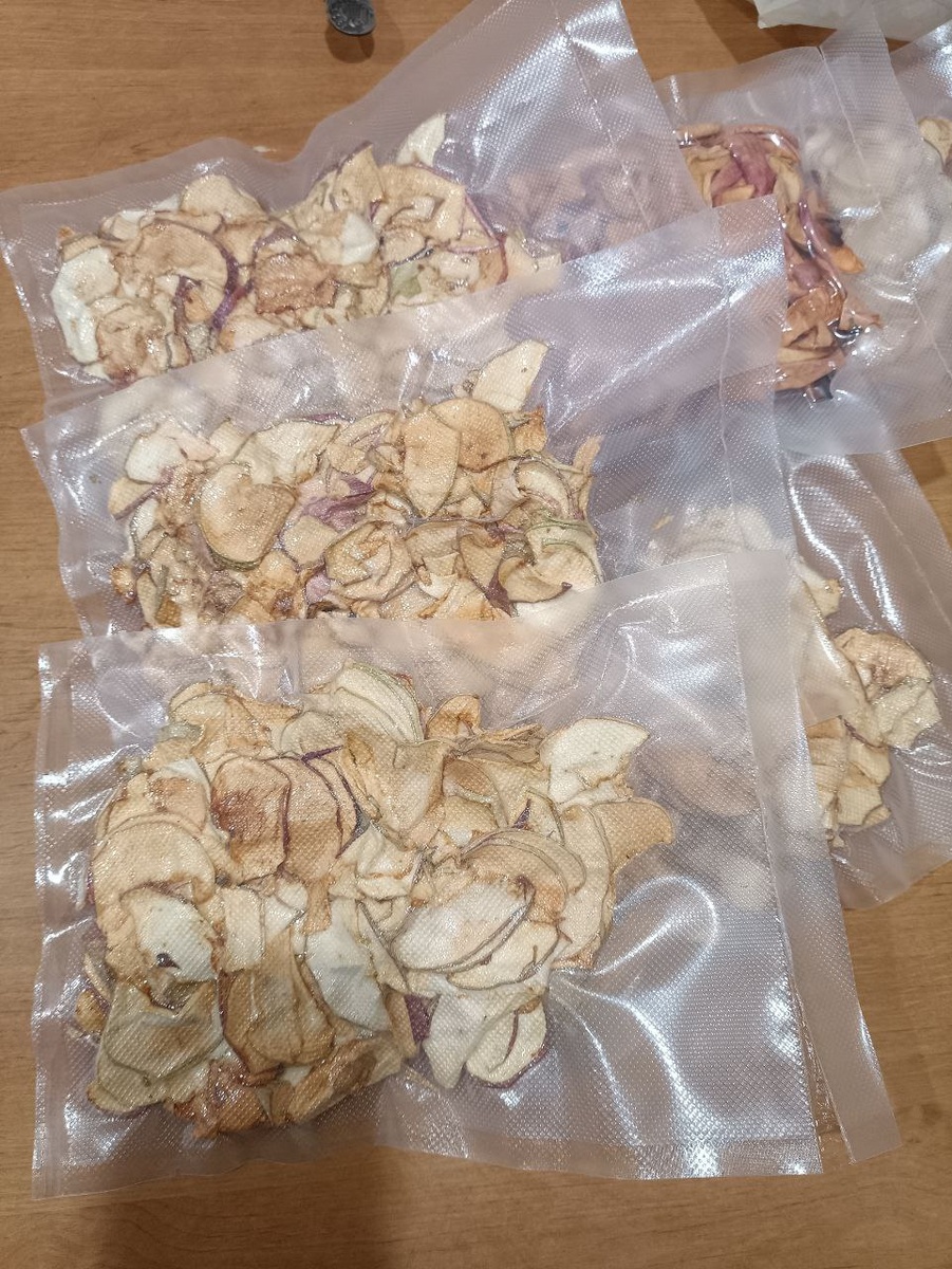 Долго думала куда и как мне прибрать сушёные яблоки) В пакетах занимают много места, пакет рвётся, в банках- ещё больше места, а его у меня нет, поэтому решила их завакуумировать. А как вы храните сухие запасы? Поделитесь опытом)