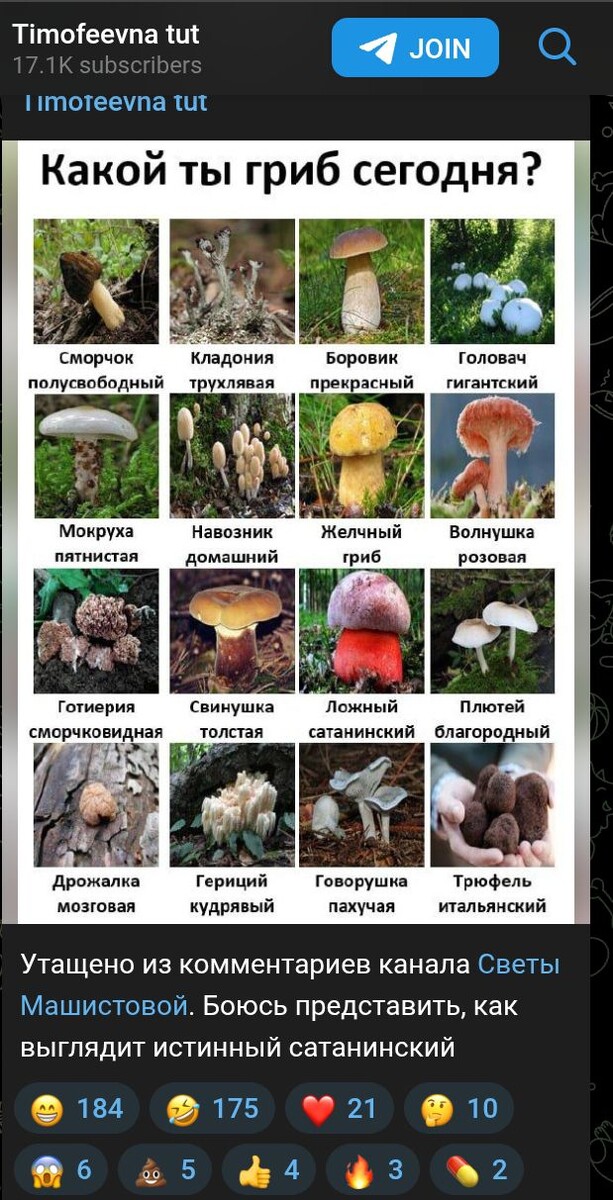 У меня нет телеграмм-канала, но я читаю Тимофеевну, так как мне нравится её речь и, к тому же, она большая любительница котов и кошек... Так, о чём это я хотела?.. А, о грибах. Так вот, у Тимофеевны есть пост о грибах - то есть картинка, на которой несколько видов грибов, один из которых её заинтересовал, но там нет гриба Весёлки! Из-за невозможности в коммментарии к посту Тимофеевны показать этот очаровательный гриб, пишу эту коротенькую статейку с "портретом" Весёлки. Тимофеевна, несправедливо обходить вниманием столь замечательный гриб. Весёлка не только забавно и кексуально выглядит, он ещё и лечебный грибочек - помогает даже мозгу и из него делают пищевые добавки для улушения работы этого органа. Ссылки правильно вставлять не научилась, коды почему-то не подходят, так что, звиняйте за стыренный контент.