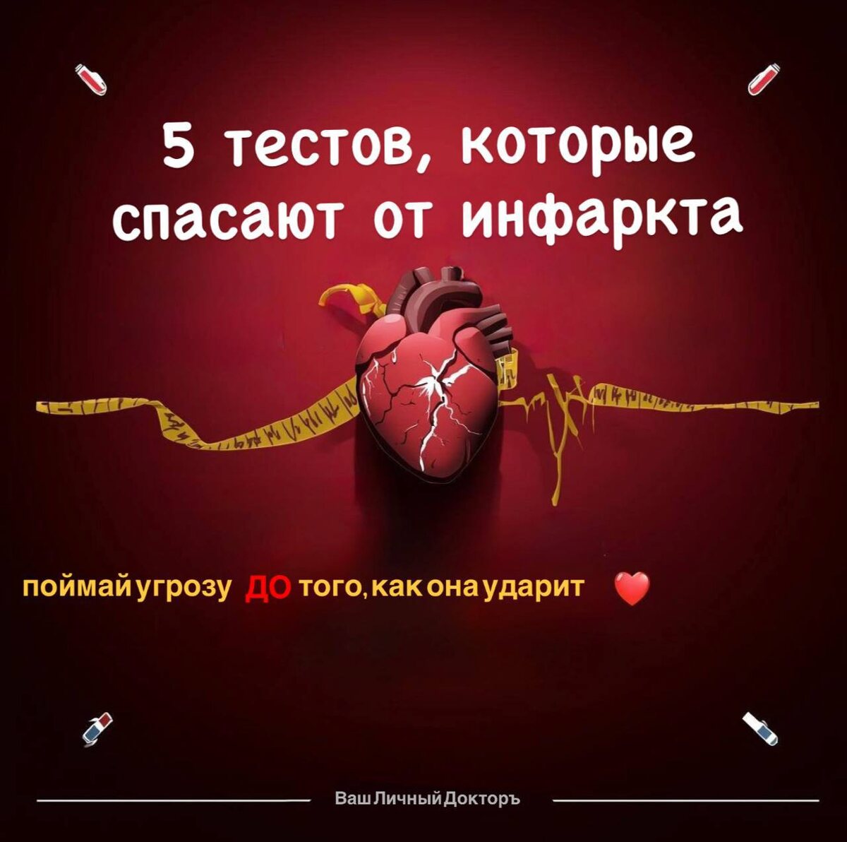 📊 Серия 3. «5 тестов, которые поймают инфаркт ДО того, как он убьёт» 🩸 Анализы крови 1️⃣ Липидный профиль • ЛПНП («плохой холестерин») ↑ → закупоривает сосуды, ускоряет рост бляшек. • ЛПВП («хороший холестерин») ↑ → защищает сердце и сосуды. Ошибка большинства — смотреть только «общий холестерин», а не детали. 2️⃣ Липопротеин(а) [Лп(а)] Наследственный «сюрприз». Даже если всё остальное в норме, высокий Лп(а) = риск инфаркта. 📌 Европейские врачи советуют: проверь хотя бы раз в жизни! 3️⃣ Факторы риска • Глюкоза + HbA1c → ловят скрытый диабет. • Щитовидка (ТТГ, Т4) → низкая функция щитовидки поднимает ЛПНП. • Креатинин + электролиты → почки напрямую влияют на давление. 🫀 Обследования сердца и сосудов 4️⃣ ДСБЦА (УЗИ сонных артерий) Словно рентген для сосудов 🚰: показывает бляшки и сужение ещё до симптомов. 📌 Делай, если ЛПНП повышен или есть семейная история инфаркта. 5️⃣ ЭКГ + ЭхоКГ • ЭКГ — ловит сбои ритма, ишемию или перебои в работе сердца. • ЭхоКГ — проверяет структу