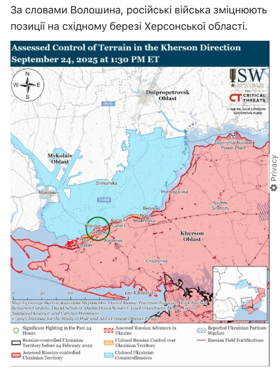 На связи спикер ВСУ Волошин, снова с грустным прогнозом для своей армии. По данным их же источников, российская армия ведёт наступательные действия на херсонском направлении. Сами признают - мы не топчемся на месте, а ведём работу планово и методично. Украинский полковник Волошин докладывает, что наши войска активно накапливаются и перегруппировываются на левом берегу Херсонщины - в районе Конки, Алешек и Антоновского моста. Там идёт укрепление позиций, готовится плацдарм для дальнейших шагов. Американские аналитики (ISW) подтверждают: Россия готовится к наступлению на Херсон. Напомним, Волошин раньше говорил, что Херсон будет накрыт нашими беспилотниками. И, как видим, его слова подтвердились - уже горят их склады, позиции, дороги под нашим контролем. А вот свежую новость комментировать пока не будем - пусть будет для них неприятным сюрпризом. 🦅 Подписаться | Наш чат ⚔️