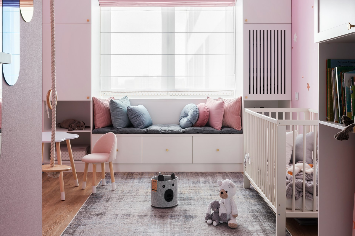 Заказчики сразу обозначили свои пожелания: комнаты для детей должны быть раздельными. Спальню для девочки оформили в стиле принцессы. Пока принцесса маленькая, обошлись простой кроватью в целях безопасности, но место под балдахин предусмотрели — на будущее.