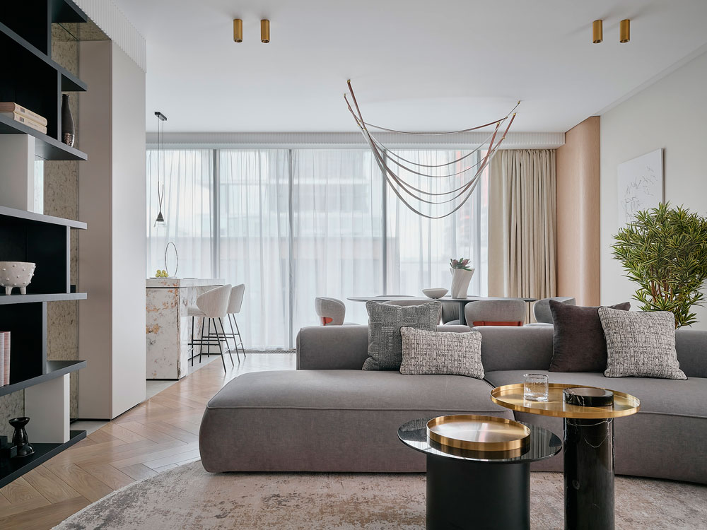 — К нам обратилась семейная пара, вдохновленная квартирой, которую мы ранее спроектировали для их друзей. Заказчики хотели создать светлый и нарядный интерьер в стиле contemporary, который сочетал бы спокойствие, лаконичность и функциональность. Важным условием было избегать ярких цветов и создать максимально нейтральный интерьер. При этом молодая семейная пара обладает очень высокой насмотренностью и, как следствие, отменным вкусом. Ребята много путешествуют, посещают красивые места — галереи, отели, рестораны, выставки, поэтому требовательны к эстетике и готовы к нестандартным решениям.