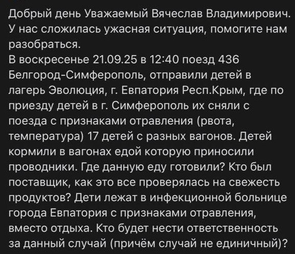 Вячеслав Гладков прокомментировал инцидент с детьми, которым стало плохо по пути в крымский лагерь К губернатору обратилась местная жительница. Она сообщила, что 17 школьников из разных вагонов поезда «Белгород-Симферополь» с признаками недомогания прибыли в Крым. По словам женщины, у детей были схожие симптомы, что вызвало подозрение на отравление едой в поезде. Глава региона уточнил, что плохо стало 19 детям. По заключению медиков, причиной недомогания стала вирусная инфекция, а не качество еды в вагонах. Мы на связи в MAX