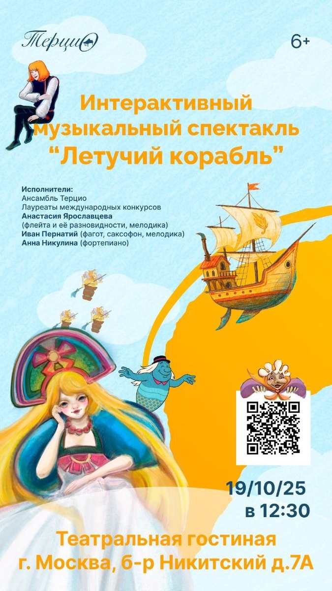 🚀 Услышать «Летучий корабль» так, как никогда раньше! Дорогие друзья! Ансамбль «Терцио» приглашает вас на интерактивный музыкальный спектакль «Летучий корабль» — путешествие, где добро побеждает, мечты сбываются, а музыка становится попутным ветром! Что вас ждёт? 🎵 Любимые песни в живом исполнении — как будто они рождаются прямо сейчас для вас. 🎵 Магия живых инструментов — флейта, фагот, саксофон и фортепиано наполнят зал волшебством. 🎵 Мультфильм на экране — подпевайте героям, как в детстве, пока ансамбль играет! А перед спектаклем — музыкальный разогрев! Мы споём с вами: → «Антошка» — готовы копать картошку с нами? → «Гуси» — проверим, кто помнит все слова! → «Метелица» — зимняя сказка в ритме вальса, → «Лапти» — зажигательные ритмы, от которых ноги сами пускаются в пляс! Сюрпризы для всех зрителей: ✨ Памятные подарки, ✨ Увлекательная викторина, ✨ Фото с музыкантами после концерта! Ждём вас: 📅 19 октября, 12:30 📍 Дом Гоголя (Никитский бульвар, 7А) Билеты в продажу поступя