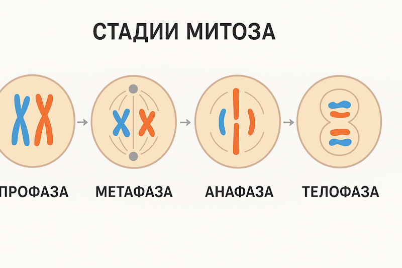 Главная особенность митоза — точное и равномерное распределение генетического материала между дочерними клетками. Процесс проходит в четыре основные стадии: