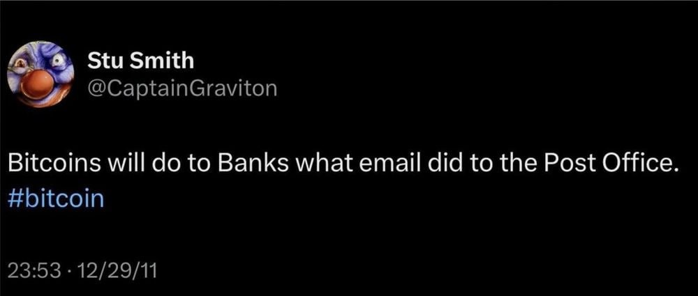 твит из 2011г: BTC сделает с банками то же самое, что email сделал с почтой.
