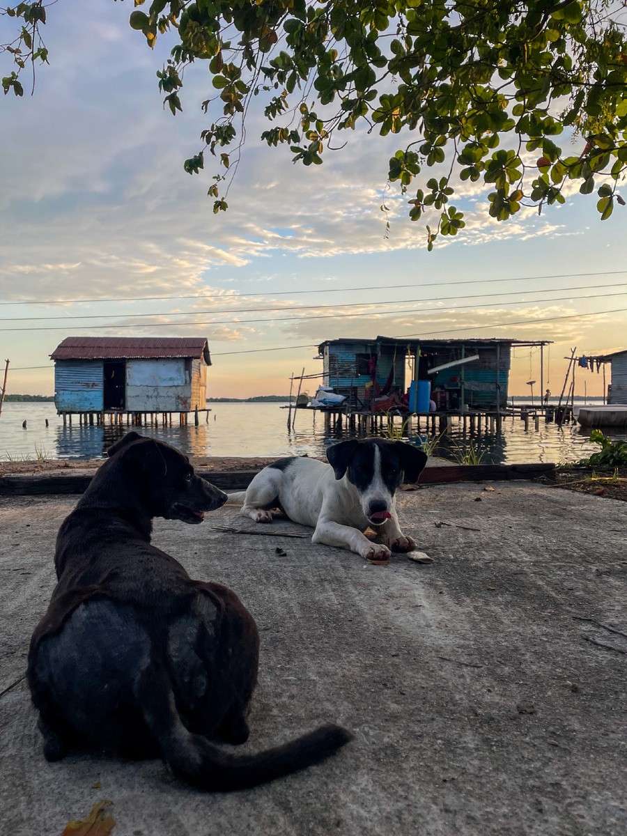 Нас доставили на лодке прямо к берегам ещё одной рыбацкой деревни под названием Ологá 🐟 И - о, да - здесь уже была полноценная земля! Грязь, песочек, небольшой лесочек - да что угодно, главное - что уже можно было ходить ногами! Собаки гоняют хрюшек, дети гоняют друг друга, взрослые сидят на своих крылечках и ведут беседы, или же занимаются рыбой (ловят, чистят, солят, перекладывают с лодки на лодку, чтобы увезти на продажу и т.п.) Дома - всё такие же палафиты, стоящие на сваях, но здесь уже живут целыми семьями на постоянной основе. Здесь нет магазинов или салонов красоты, отсутствует какой-либо намёк на цивилизацию, повсюду бегают курочки и поросята, здесь нет даже мобильной связи и вайфая! Сложно поверить, что ещё есть кто-то, кто живёт вот так. Здесь дети не знают, что такое шоколадки и газировки: их главные забавы - лазать по деревьям и срывать свежие фрукты, иногда гонять мяч на берегу да на лодках кататься. На нас смотрели, кажется, как на сумасшедших, когда мы сказали, что